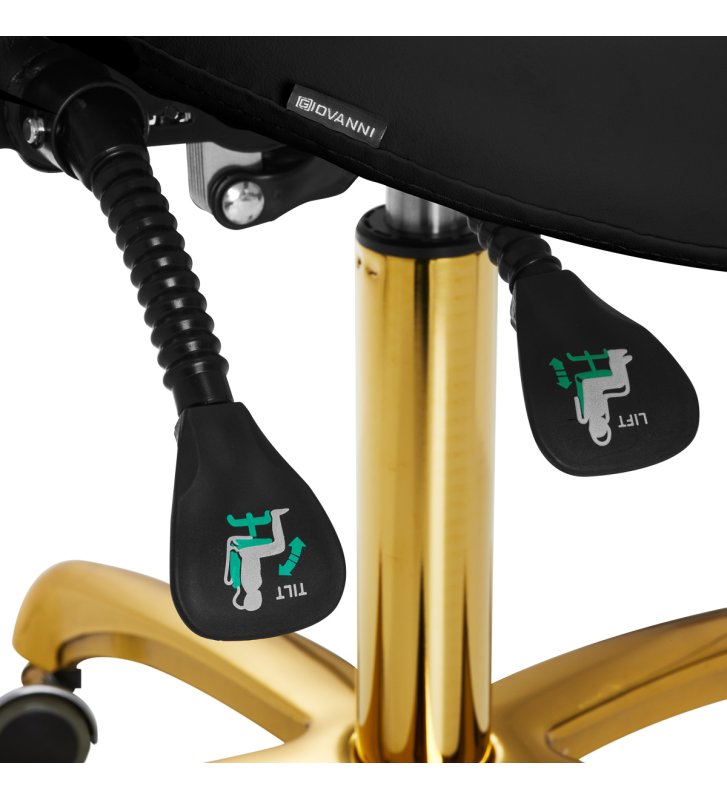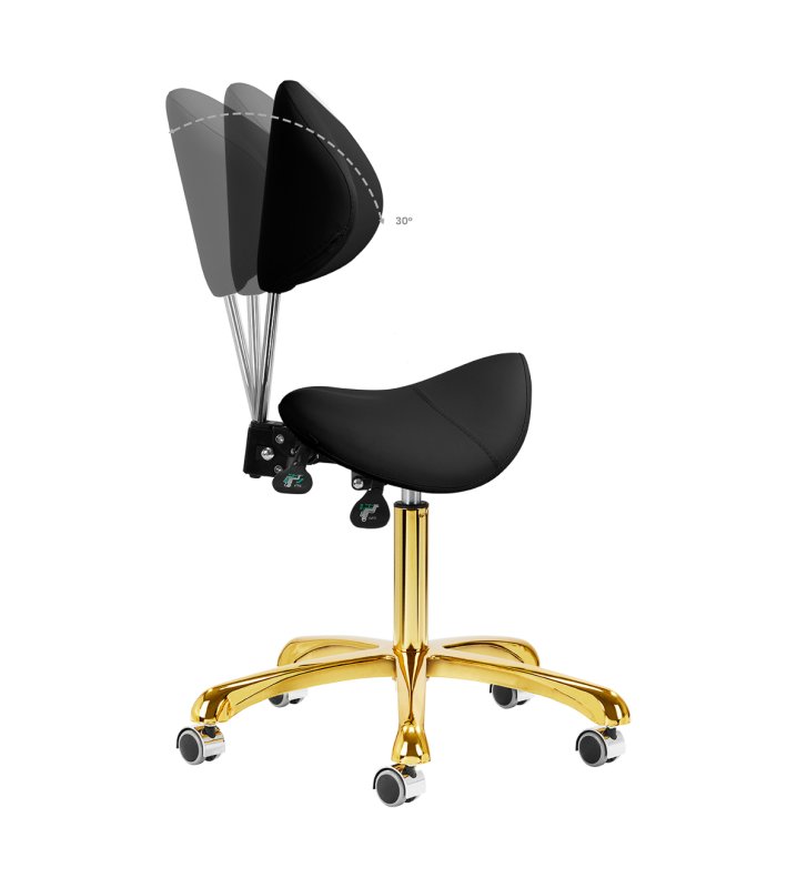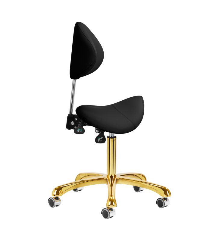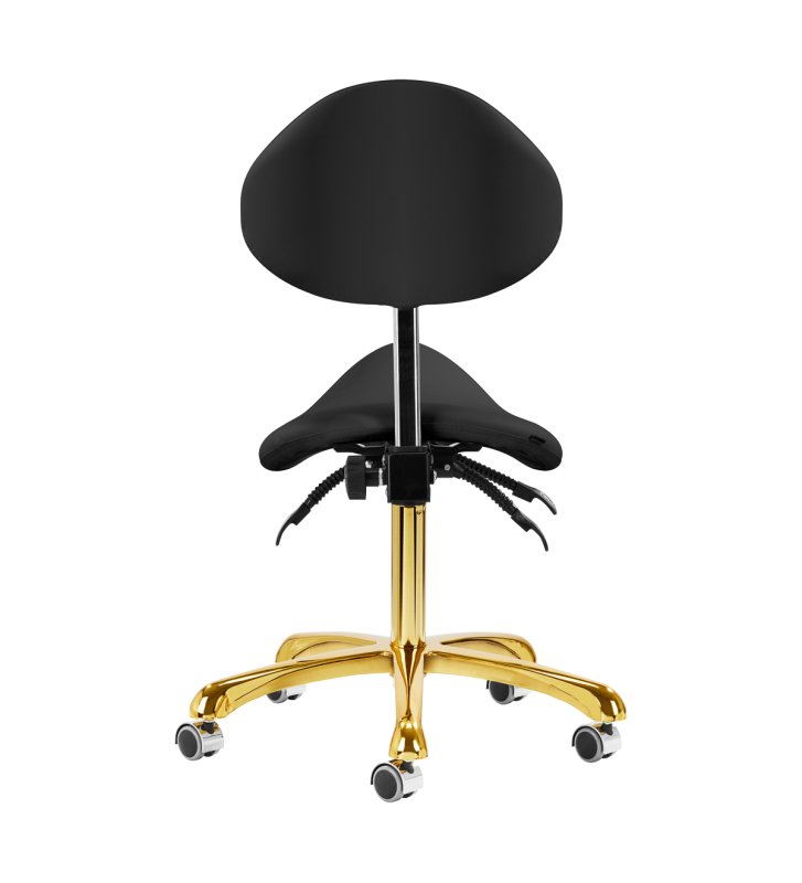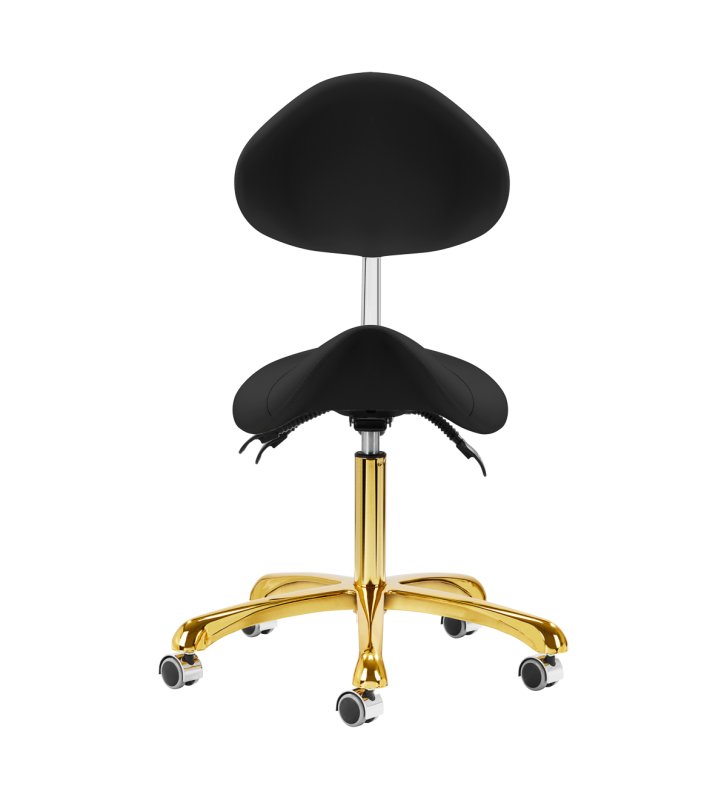 Pięcioramienna, odpowiednio zaprojektowana podstawa w odcieniach złota sprawia, że taboret jest stabilny, nawet podczas intensywnej pracy. Kółka zapewniają znaczną mobilność, co ułatwia przemieszczanie mebla po gabinecie. Obicie wytrzymałego taboretu wykonano z imitacji skóry w odcieniach czerni. Dzięki użyciu takiego materiału taboret jest odporny na wilgoć i łatwy w czyszczeniu.