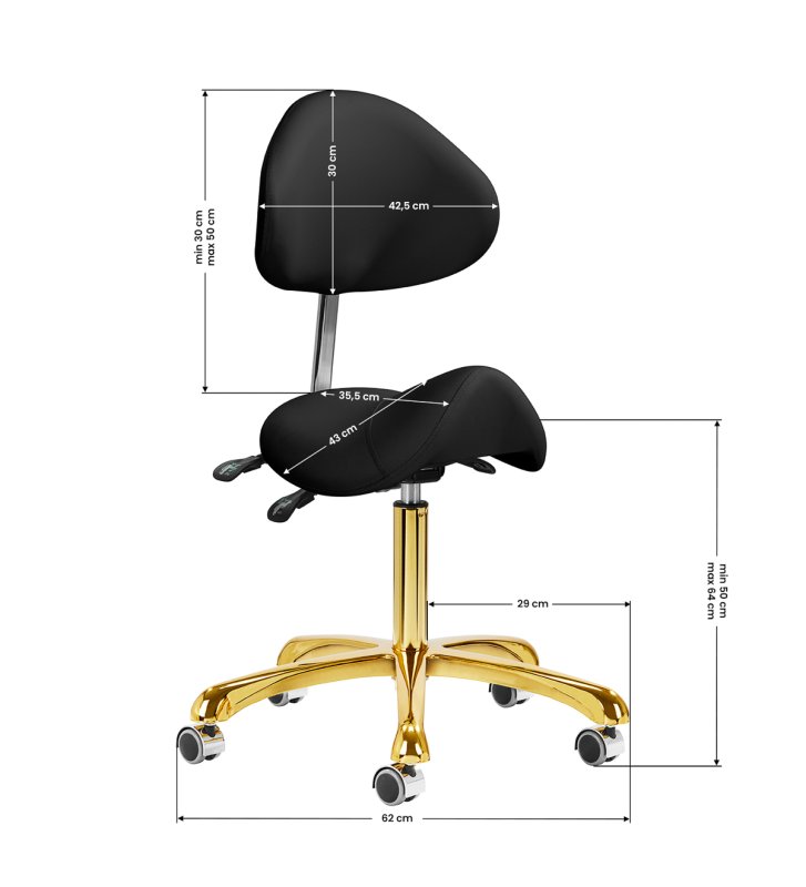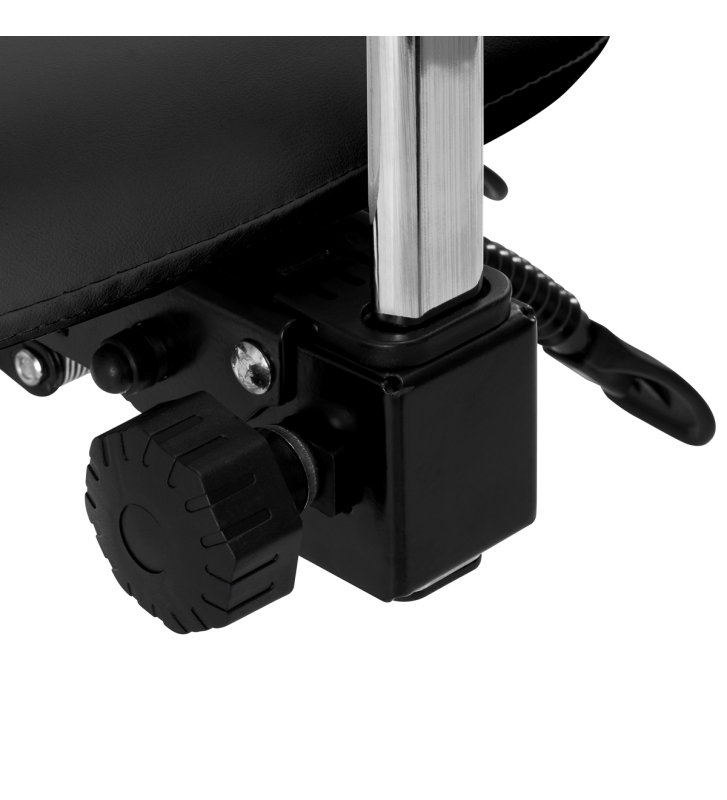 Możliwość regulacji wysokości siedziska w zakresie 50-64 cm pozwala specjaliście przybrać odpowiednią pozycję w trakcie wykonywania usług. Wyprofilowane oparcie, z możliwością wysunięcia o 20 cm, zapewnia doskonałe wsparcie pleców, niezależnie od wzrostu użytkownika. Mechanizm pełnego obrotu sprawia, że praca staje się bardziej efektywna i wygodna. Krzesło posiada również funkcję kołyski z możliwością blokady, co pozwala na ergonomiczne ułożenie ciała podczas pracy. Odpowiednio wyprofilowane na kształt siodła siedzisko wypełnione niepodatną na odkształcenia pianką gwarantuje użytkownikom wygodę i ergonomię pracy.