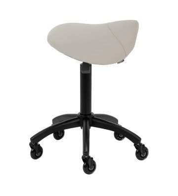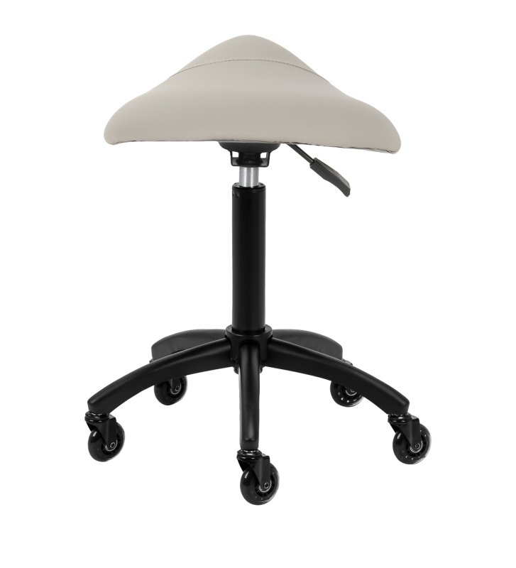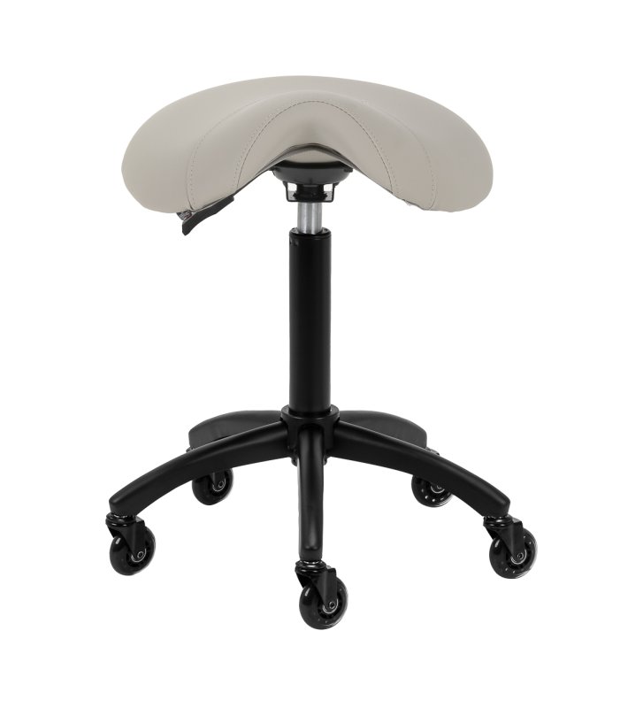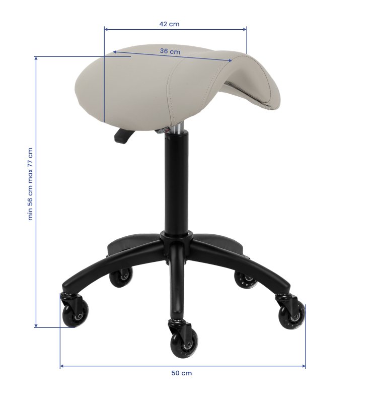 Regulacja wysokości siedziska w zakresie 56-77 cm pozwala specjaliście dostosować pozycję w trakcie wykonywania usług. Odpowiednio wyprofilowane na kształt siodła siedzisko wypełnione niepodatną na odkształcenia pianką gwarantuje użytkownikom wygodę i ergonomię pracy. Mechanizm pełnego obrotu sprawia, że praca staje się bardziej efektywna i wygodna. Mobilność zapewniają kółka Roll Speed z żelaznym rdzeniem i powłoką z poliuretanu (PU), które łączą płynność ruchu z wyjątkową odpornością na zużycie. Zastosowanie łożysk klasy ABEC-7 sprawia, że taboret porusza się łatwo, co znacząco ułatwia manewrowanie.