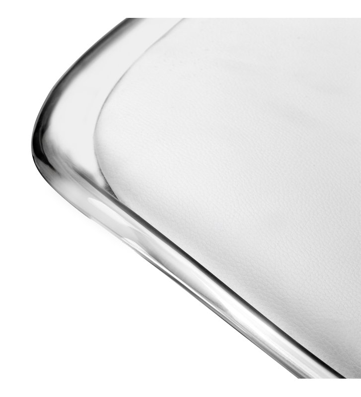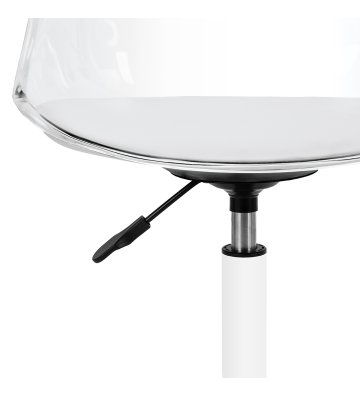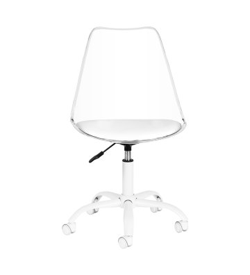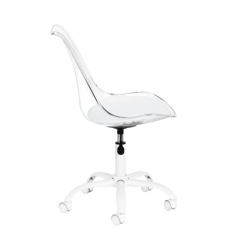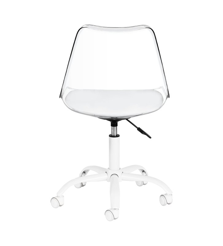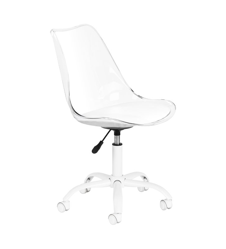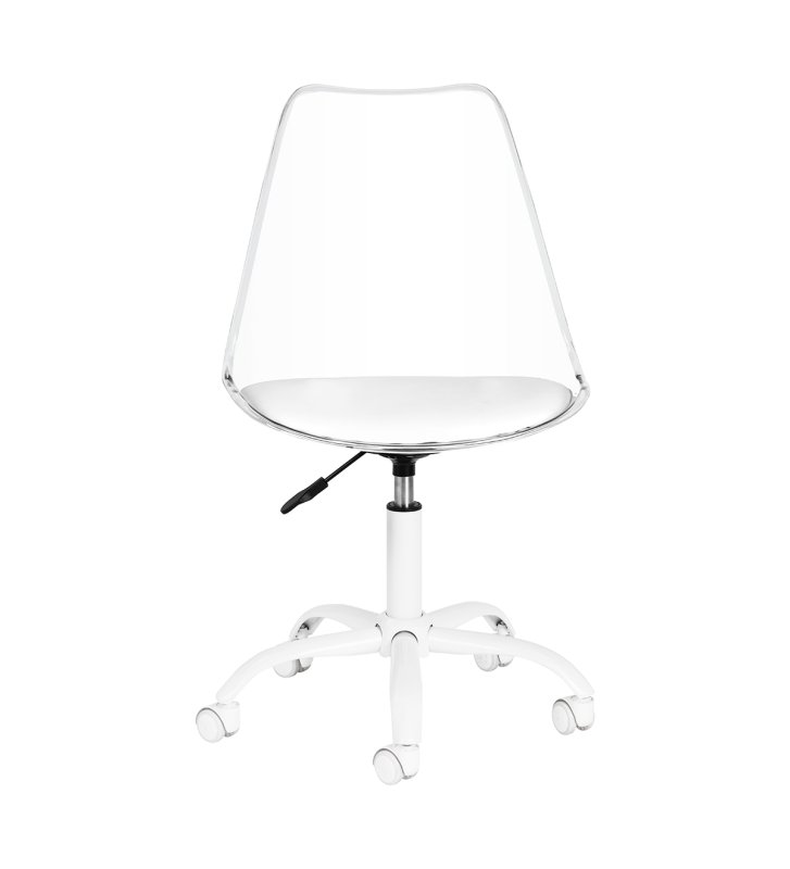 Model przyciąga uwagę efektownym, transparentnym oparciem, nadającym całości lekkości i nowoczesnego charakteru. Połączenie przejrzystej konstrukcji z tapicerowaną białą skórą syntetyczną poduszką siedziska oraz białą podstawą tworzy wyrafinowany kontrast podkreślający elegancję. Dzięki temu krzesło staje się nie tylko funkcjonalnym elementem wyposażenia, lecz także stylową ozdobą gabinetu. Świetnie komponuje się z każdym wnętrzem, doskonale wpisując się w estetykę współczesnych salonów beauty.