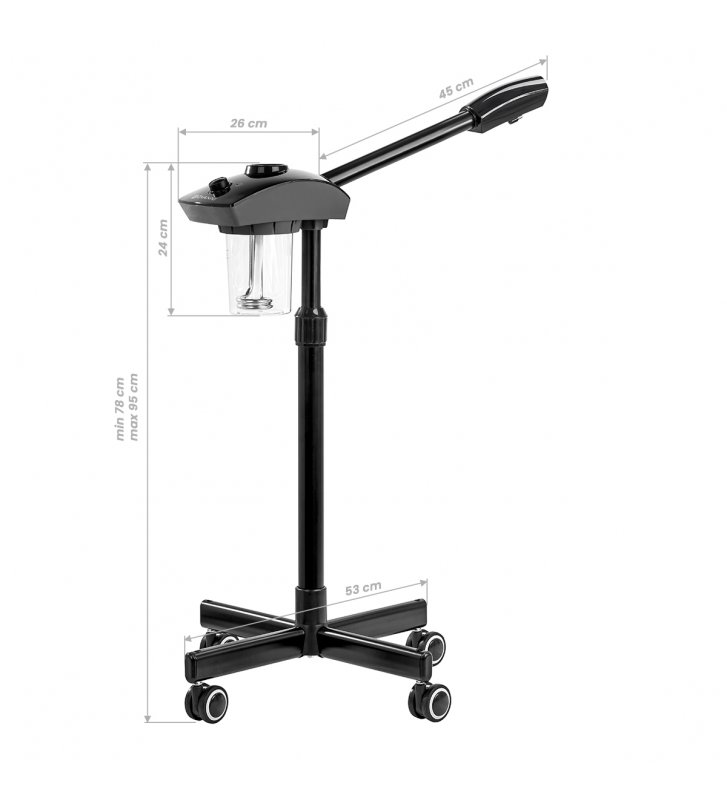 Wapozon wykonano z tworzywa sztucznego w odcieniach czerni, co sprawia, że urządzenie łatwo utrzymać w czystości. Statyw wyposażony jest w prostą regulację wysokości w zakresie 78-95 cm, co pozwala na ustawienie sprzętu na odpowiednim poziomie, by zapewnić komfort pracy osobie wykonującej zabieg. Dyszę wapozonu można obracać, co zwiększa zakres możliwego ustawienia. Czteroramienna podstawa o gumowanych kółkach poprawia mobilność, ułatwiając swobodne przestawianie urządzenia.