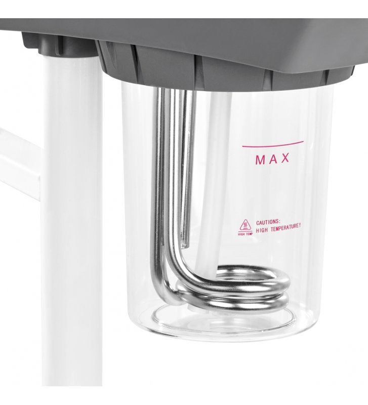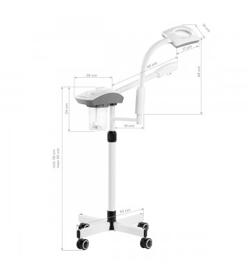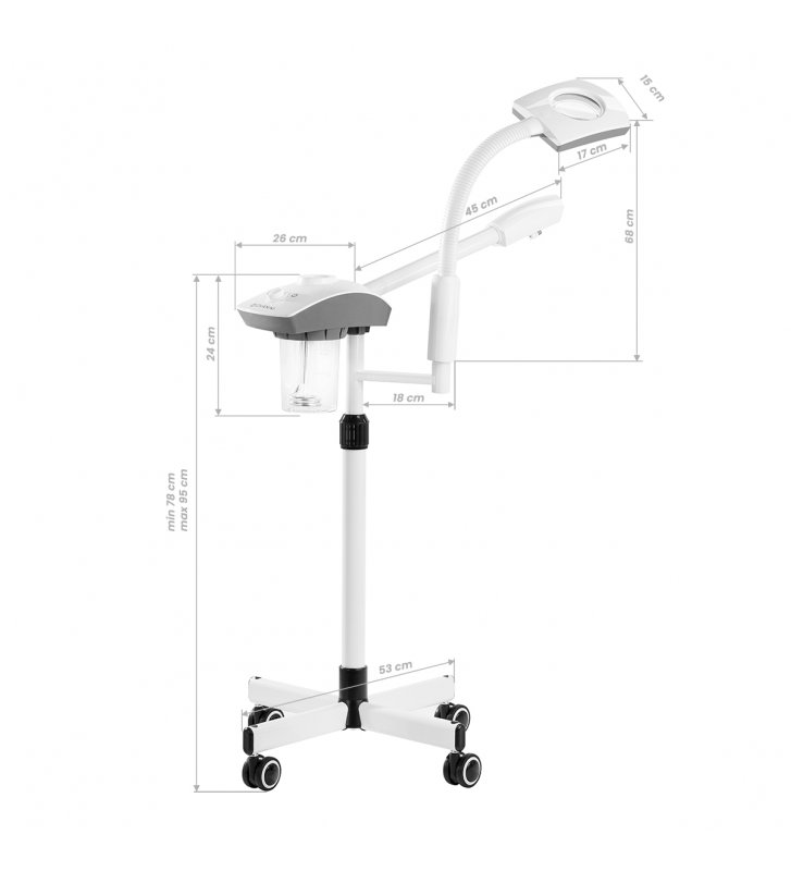 Wapozon wykonano z tworzywa sztucznego w odcieniach bieli, co sprawia, że urządzenie łatwo utrzymać w czystości. Statyw wyposażony jest w prostą regulację wysokości w zakresie 78-95 cm, co pozwala na ustawienie sprzętu na odpowiednim poziomie, by zapewnić komfort pracy osobie wykonującej zabieg. Zarówno lampę lupę, jak i dyszę wapozonu, można niezależnie obracać, co zwiększa zakres możliwego ustawienia. Czteroramienna podstawa o gumowanych kółkach poprawia mobilność, ułatwiając swobodne przestawianie urządzenia.